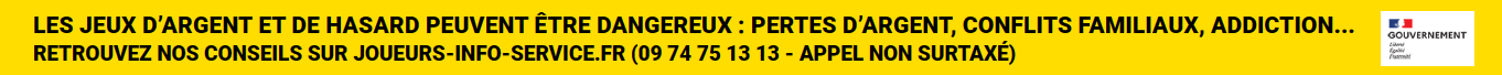 INTERDICTION VOLONTAIRE DE JEUX : Toute personne peut demander à être interdite de jeux. Cette demande est formée auprès de l'Autorité Nationale des jeux. Rendez vous à l'adresse suivante pour demander votre interdiction de jeux : https://anj.fr/ts/demande-interdiction